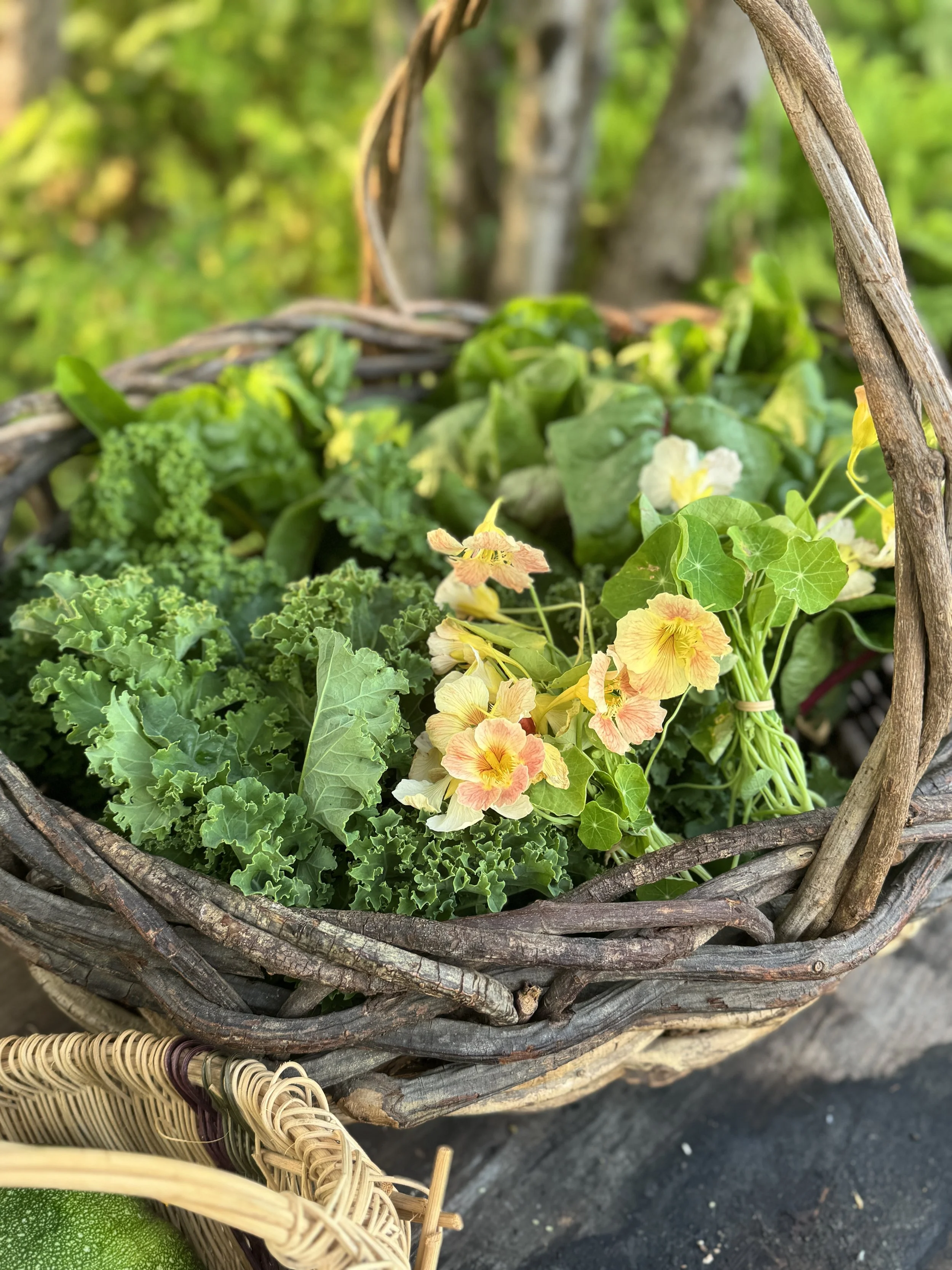 Lizzie has brassicas, bok choi, mustard greens, salad greens, leeks, onions, and garlic planted out and starting to kick into gear.